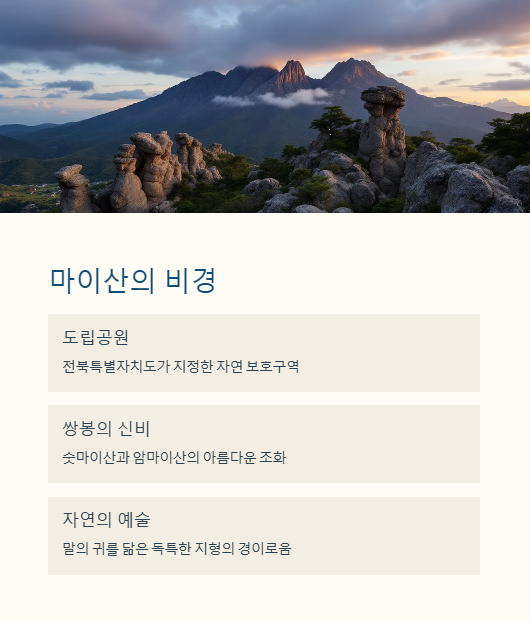 산약초공원에서 출발해 마이산으로 이어지는 풍성한 자연 경관 속 트래킹 코스는 몸과 마음을 편안하게 하는 힐링 여정을 제공합니다. 특히 마이산에서는 탑사와 은수사 같은 아름다운 사찰들이 있어 문화와 역사를 느낄 수 있는 관광지로 매력적입니다.