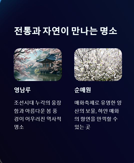 양산과 밀양은 자연의 아름다움과 역사적 유산이 공존하는 지역으로, 계절에 따라 색다른 매력을 선사합니다.